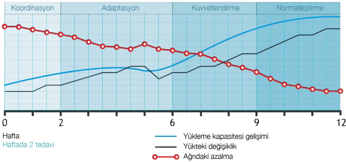 Şekil 10: Ağrılı eklemler ve doku, yükleme ve hareket aralığı koşullarını kritik derecede sınırlayabilen faktörlerdir. Bu şema, yükleme devamlılığının tedavi sırasında nasıl kontrol edildiğini göstermektedir. Yüklemeyi ağrı eşiğinin altında tutarken aynı zamanda kaslardaki ve dokudaki adaptif değişiklikleri sağlamayı amaçlamak önemlidir. Bu örnekte, ağrı izleme özelliği, durum stabilize olana kadar yükü azaltma işlemini başlatılmıştır.