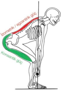 Şekil 11: Bu bileşik egzersizde hem kalça hem de sırt uzatıcılar aktive edilmiştir. Zayıf sırt, izometrik kuvvet kullanılarak korunurken , asıl iş kalça uzatıcı kasları ile gerçekleştirilir. Bu tür egzersizler iyi koordinasyon gerektirir ve yükler arttıkça hızla tehlikeli hale gelebilir.