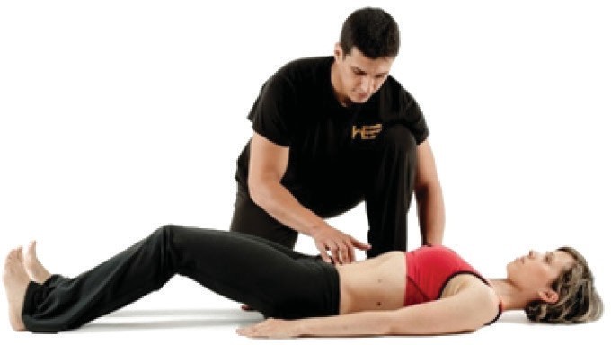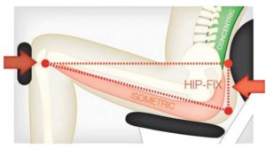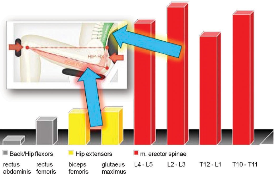 Şekil 12: Hip-Fix çözümü, uygun fiksasyonun çalışma etkisini tam olarak gereken yere hedeflemeyi mümkün kılan iyi bir örnektir. Bu güvenli bir egzersizdir ve omurgayı omurlar arası bir hareket yaratmaya zorlar; bu hareketin başka yöntemlerle kontrollü bir şekilde yapılması çok zordur. Kritik küçük omurga kasları ve multifidus etkili bir şekilde çalıştırılır.