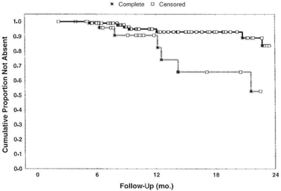 Şekil 18: Aktif ayakta rehabilitasyondan sonra fiziksel egzersiz gruplarının bel ağrısı nedeniyle işe devamsızlık yapmadan yaşa- ma devam etme modelleri (Kaplan-Meier). Düz çizgi (yukarıdaki) herhangi bir fiziksel aktiviteye sahip olan grubu belirtir; Noktalı çizgi (aşağıda) fiziksel olarak aktif olmayan grubu belirtir. Grup farkı istatistiksel olarak anlamlıydı (P, 0.01).