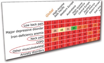 Şekil 2: WHO istatistikleri, bel ağrısının, engelli yaşamın bir numaralı sebebi olduğunu göstermektedir. İnsanlar yaşadıkları ülkelerin iktisadi gelişimi ya da bulunduğu yerden bağımsız olarak aynı şekilde acı çekiyorlar.