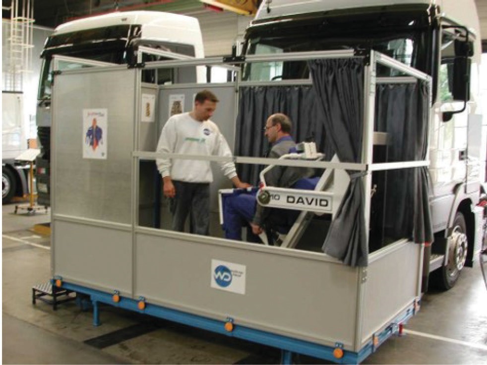 Şekil 20: Fabrikanın büyüklüğünden ötürü, eğitim platformunu işçilerin olduğu yere taşımak, onları Daimler Chrysler fabrikasın- daki uzun mesafeleri yürütmekten daha kolaydı. Haftada bir kez bir uzatma egzersizi bile hastalık izni vakalarının % 48 oranında düşmesine neden oldu.