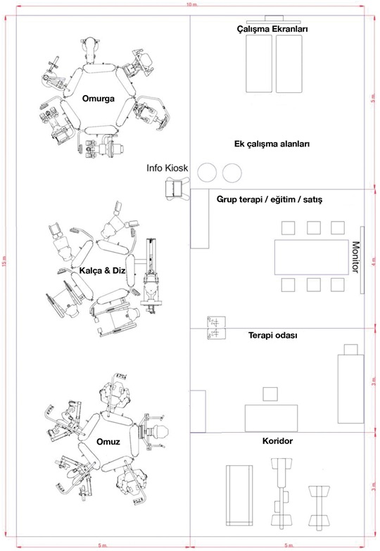 David cihazlarıyla kurulan fizik tedavi merkezi alan kullanımı açısından oldukça verimli hale getirilebilir. Aşağıdaki alan tahsis örneğinde konseptin tüm unsurları mevcuttur ve 150 metrekareye sığmak mümkündür. Diğer tesisler mevcut olduğunda, eğitim alanı için gerekli olan alan sadece 75 metrekaredir. Daha yüksek hacimler gerekirse, cihazların bazılarını iki kere kullanarak (örneğin, sol/sağ rotasyon) çıktılar artırabilir. Bu durumda daha fazla alana ihtiyaç duyulabilir.