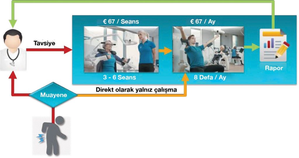 Sorunların sadece artış gösterdiği bir sağlık sistemine para dökme eğilimindeki güncel yaklaşım sürdürülebilir değildir. Bu gidişatı değiştirmek üzere çarpıcı bir olayın gerçekleşmesi gerektiği bizce oldukça açık. Fizyo terapide geri ödeme, Finlandiya’da neredeyse yok diyebiliriz. Bu da bizi yenilikçi ve maliyet tasarruflu yeni yöntemler aramaya itiyor. Müşterilerimize mümkün olan en iyi bakımı sunmak için onlara yüksek ücretler ödetmek istemiyoruz. Geçtiğimiz Eylül’den bu yana Helsinki’deki ana merkezimizde yeni bir model test edildi. Merkez, iki bölüme ayrıldı: 1) müşterilerin referans ile gelerek bir fizyoterapist tarafından tedavi edildiği tıbbi bölüm ve 2) müşterilerin bir kısmının doğrudan geldiği bir kısmının da başlangıç tedavisinin ardından geldiği üye bölümü. Sonuçlar şaşırtıcıydı. Tipik bir hasta, tavsiye üzerine 10-15 seans için gelir. Çoğu zaman, yalnızca üç seans sonra, EVE yazılımının rehberliğiyle bağımsız olarak çalışma yapabilen hastanın yanında terapistin durma gerekliliği tamamen ortadan kalkar. Sonuçlar, terapistin gözetimi altındaki seanslarda olduğu gibi kendisi çalışan hastalarda iyileşme oranlarının da hemen hemen aynı olduğunu gösteriyor. Ayrıca gerektiği takdirde müşterilerin, uzman yardımına erişimi her zaman var. Sağdaki şekil, bu modelin nasıl çalıştığını gösteriyor. Hastalar doğrudan veya bir doktor vasıtasıyla gelebilirler.