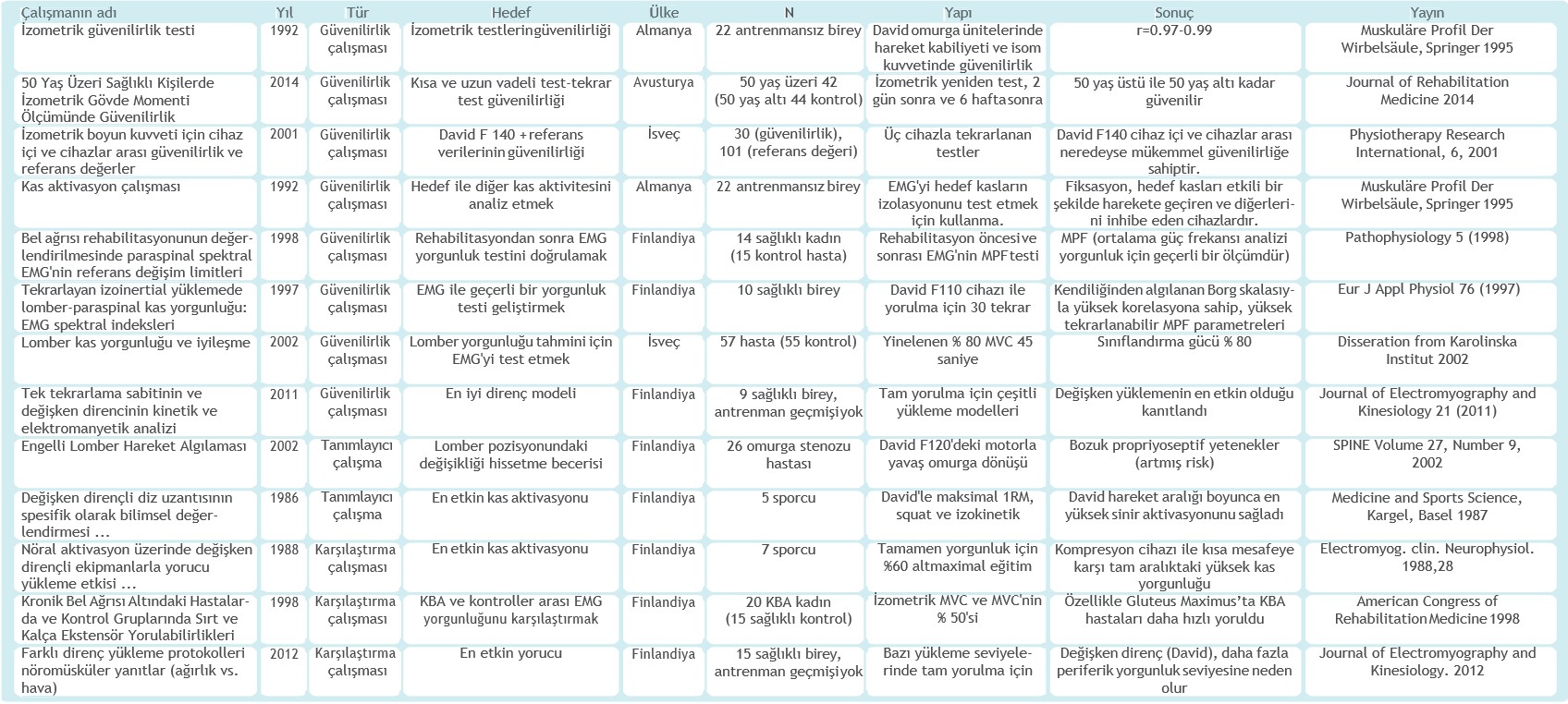 EMG doğrulama çalışmaları, Köln Üniversitesi ile işbirliği içinde David’in izolasyon ilkesinin gerçekten hedef kasları yorup çevresindeki güçlü kasları durdurduğunu tespit etmek için yapıldı2. Bu çalışmalar, güçlü kalça extensorlarının bloke edilişinin yanı sıra aslında omurgaya ait hedef kaslarda yüksek seviyede hareketin de engellendiğini güzel bir şekilde gösterdi. Sırt hastaları ve sağlıklı kişilerle EMG spektral analizi kullanılarak bir dizi yorgunluk çalışması yapıldı ve bu yöntemlerin tanı ve sonuç aracı olarak kullanılıp kullanılamayacağı araştırıldı3. Bir sonraki çalışmada, MFP’nin (EMG ortalama güç frekansı) rehabilitasyon sonrası sonuçlarda geçerli bir ölçüt olup olmadığı test edildi4. Optimal yükleme yöntemleri hakkında daha fazla bilgi edinmek için ikibinlerde iki çalışma daha yapıldı. Birinci çalışma, bacak presi egzersizindeki değişken ve sabit direnci karşılaştırarak inceledi ve en iyi antrenman etkisinin (David G210 Çok İşlevli Bacak Pres’in de kullanılan) değişken dirençli bir yöntemle hafifçe artan yük ile elde edilebileceğini buldu5.