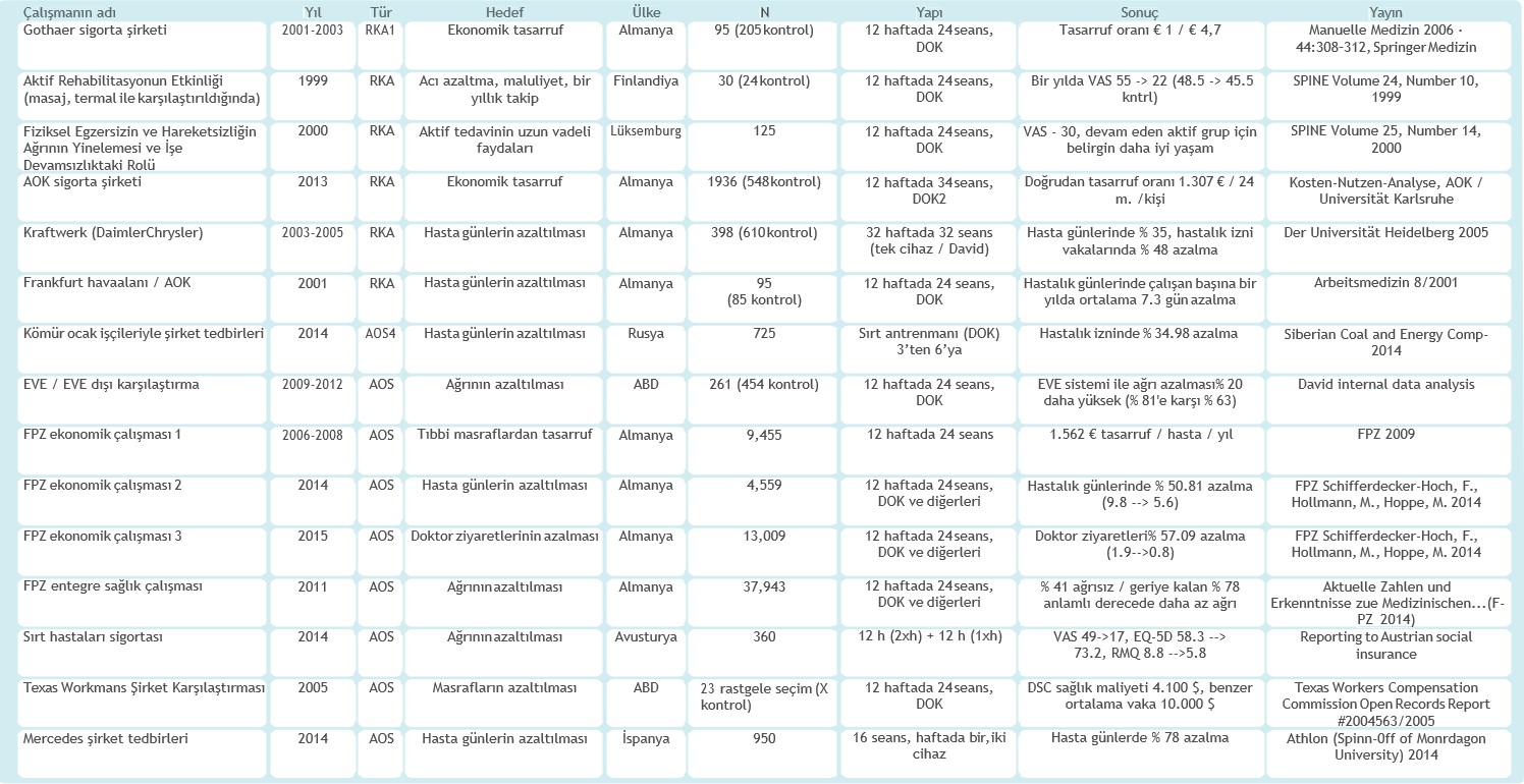David sisteminin medikal ve ekonomik etkinliğini analiz eden, çoğunlukla sırt problemleri ile ilgili birçok çalışma bulunuyor. En iyi çalışmaların bazıları Spine gibi önde gelen tıbbi dergilerde yayınlandı. Bir randomize araştırma, kronik bel ağrısı olan hastalarda aktif rehabilitasyon ve pasif kontrol tedavisinin sonuçlarını 6 ay ve 1 yıl süreyle takip ederek karşılaştırdı. Aktif aşamalı tedavi programı ağrıyı ve hastanın kendisini kısıtlamasını azaltmada ve ayrıca bel dayanıklılığının arttırılmasında pasif kontrol tedavisine göre daha başarılı oldu7. Bir başka çalışma, aktif poliklinik bel çevresi rehabilitasyonundan sonra, fiziksel egzersizin ve hareketsizliğin uzun vadeli sonuç üzerindeki rolleri incelendi.