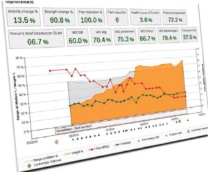 Şekil 9: Tek bir düğmeye dokunarak yükleme ve hareketlilikteki ilerleyişi, ağrı azalmasını ve seçilen anket indekslerini gösteren bir raporun çıktısı alınabilir.